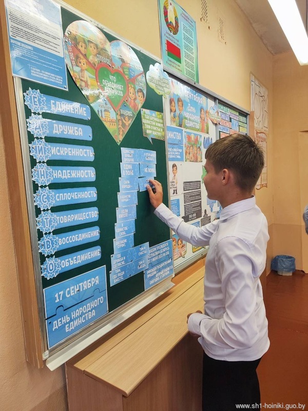 Совет старшеклассников средней школы №1 города Хойники к празднику Дня народного единства активно включился в областную акцию «Народ. Единство. Будущее», организовав распространение тематических информационных материалов среди жителей своего города