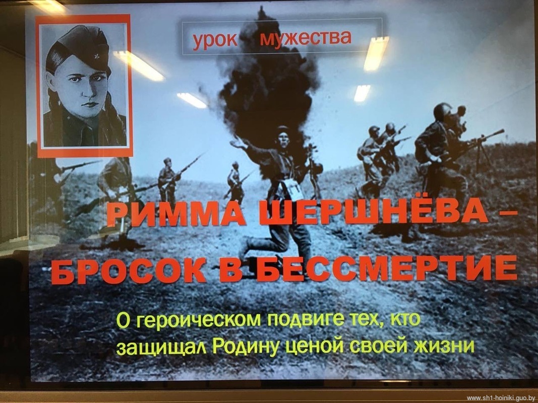 Подвиг самопожертвования — самый святой подвиг в летописи Великой Отечественной войны. «Римма Шершнёва – бросок в бессмертие». Под таким названием прошёл урок мужества  с учащимися 7-9 классов.  В ходе мероприятия ребята узнали о подвиге белорусской партизанки, совершившей бросок на вражеский пулемет, чтобы прекратить смертельный огонь и выиграть для своих товарищей в захлебнувшейся атаке драгоценные минуты и секунды для ее продолжения. Этот подвиг в годы войны получил название «подвиг рядового Матросова».