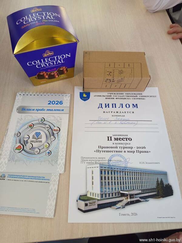 В г. Мозыре состоялся "Правой турнир-2026", в котором приняла участие команда ГУО "Средняя школа N1 г. Хойники". Целью таких турниров является популяризация правовых знаний, выявление одаренных учащихся, подготовка к будущей профессии. Команда старшеклассников учреждения продемонстрировала знания основ отраслей права, упорство, умение вести дебаты и заняла  II  место. Победителям вручили диплом и памятные подарки. Вот это каникулы с пользой!