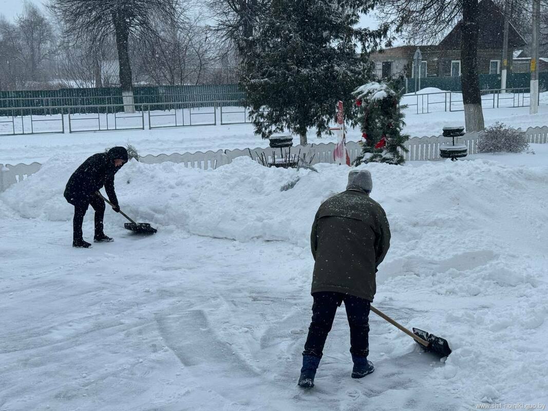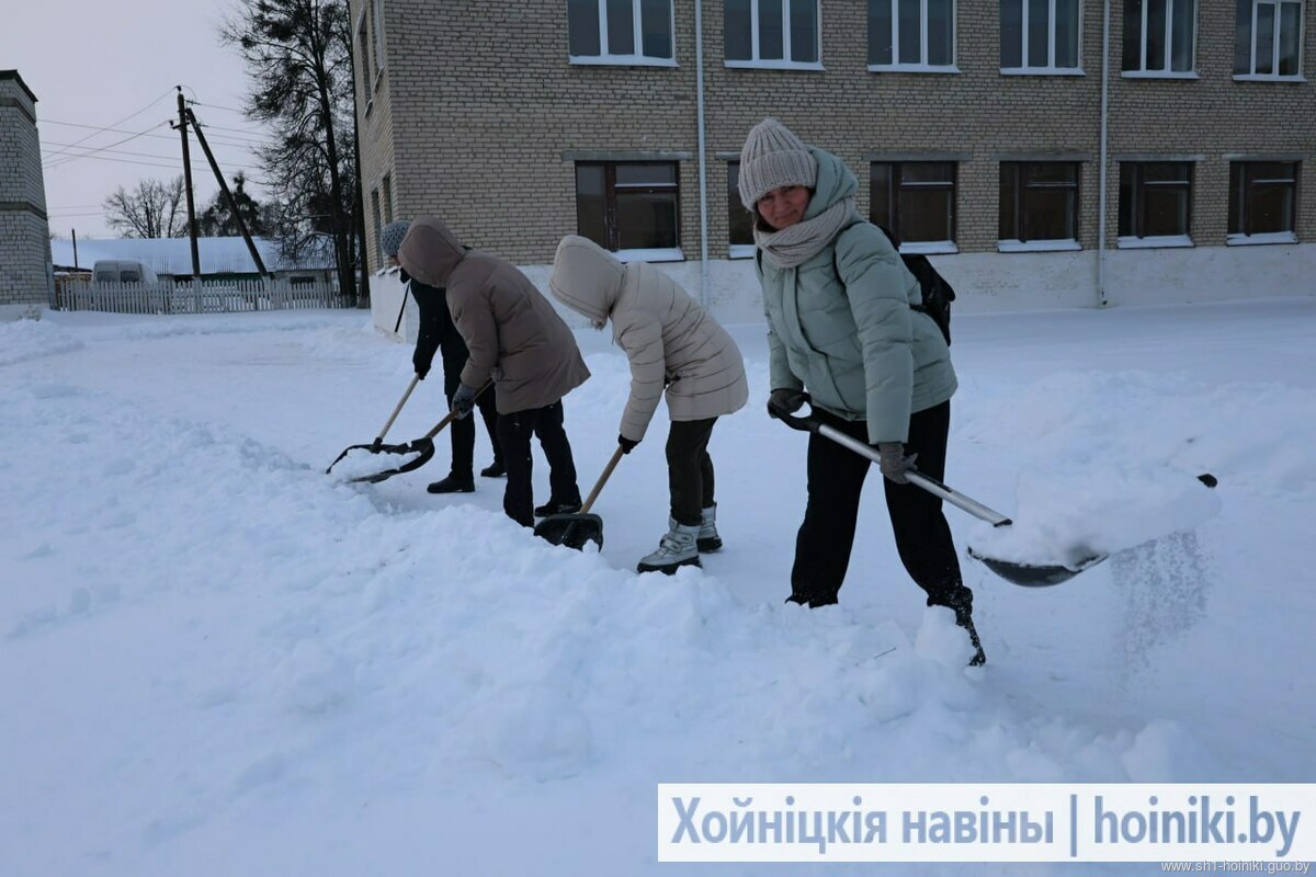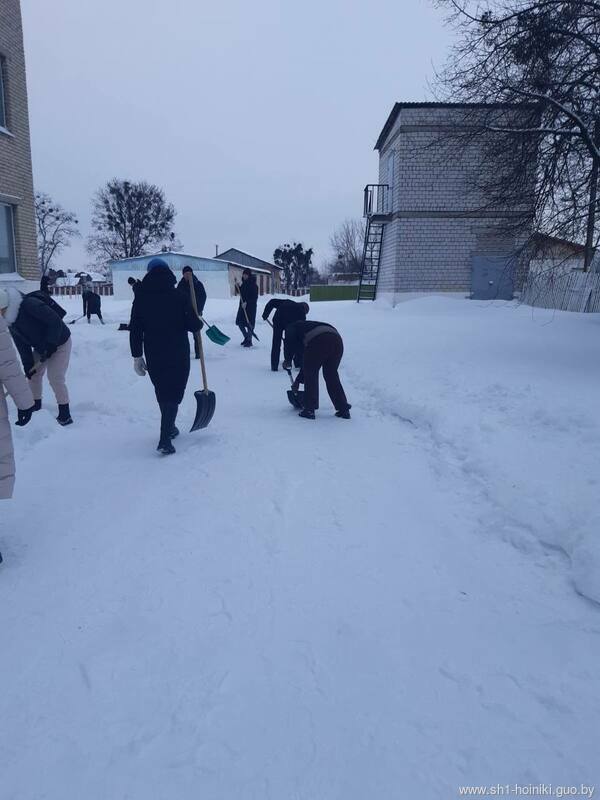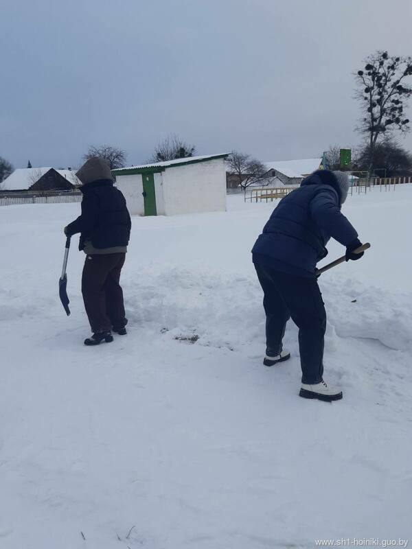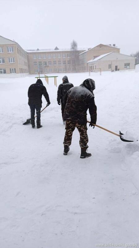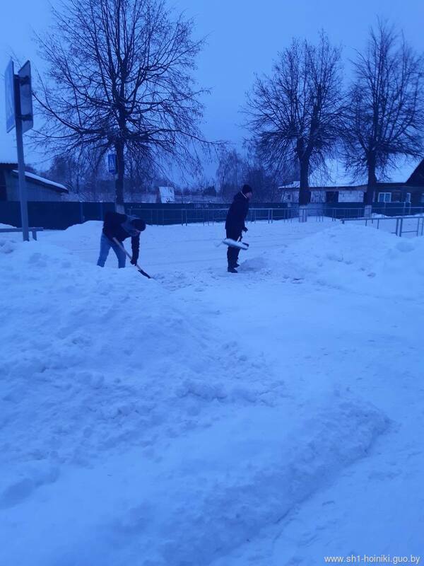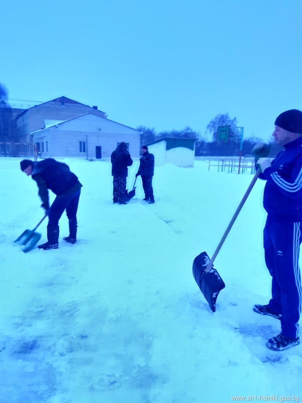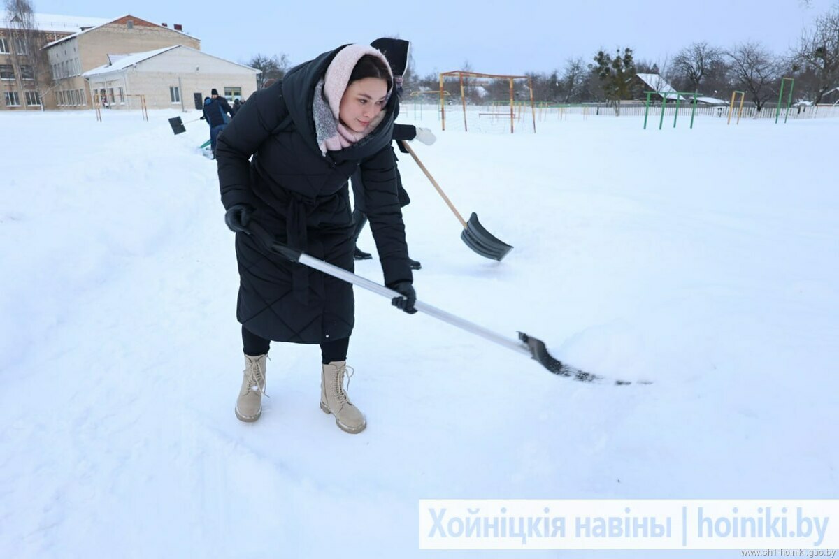 Плечом к плечу с педагогами трудятся и старшеклассники - парни ловко машут лопатами, метр за метром освобождая площадку от снега.