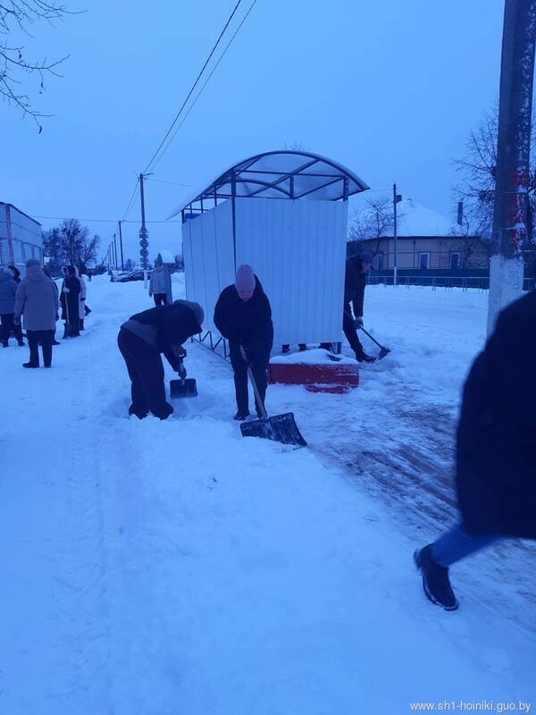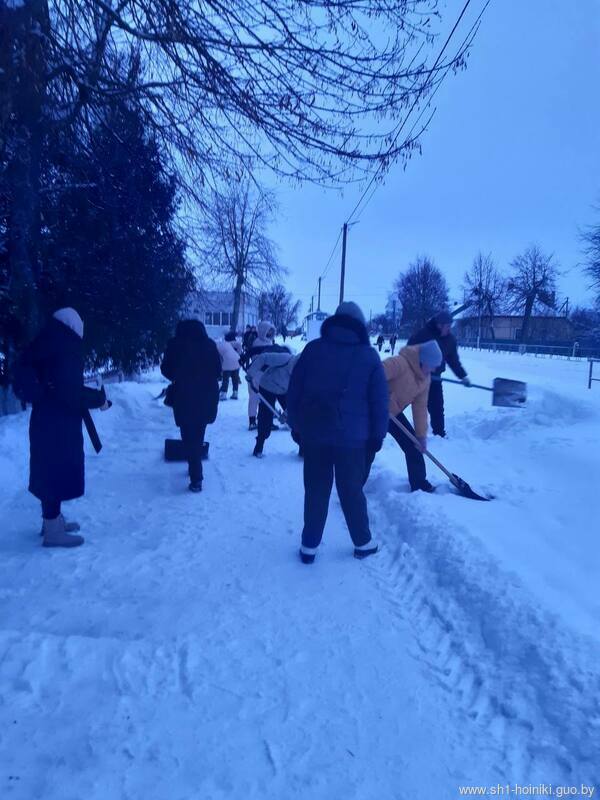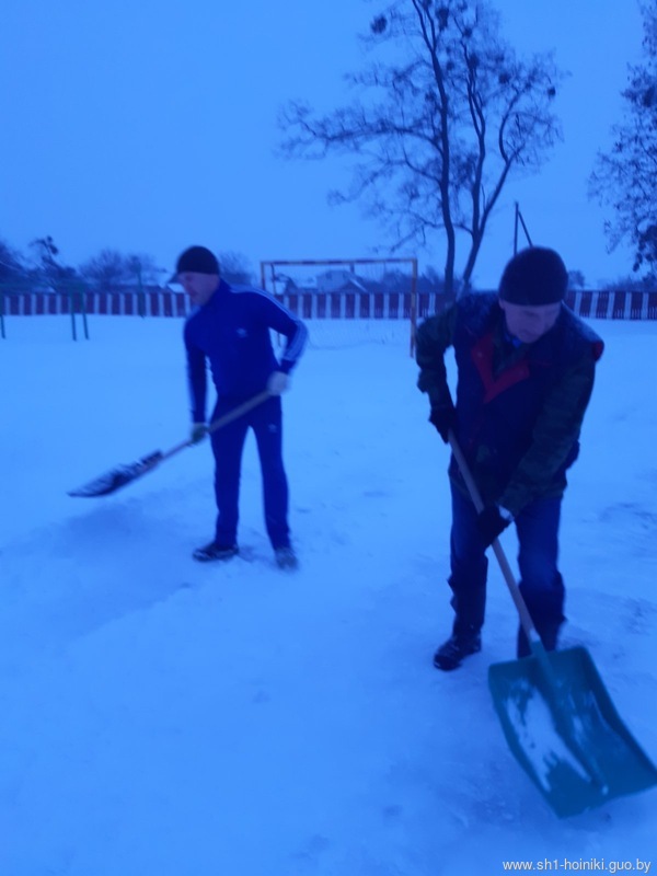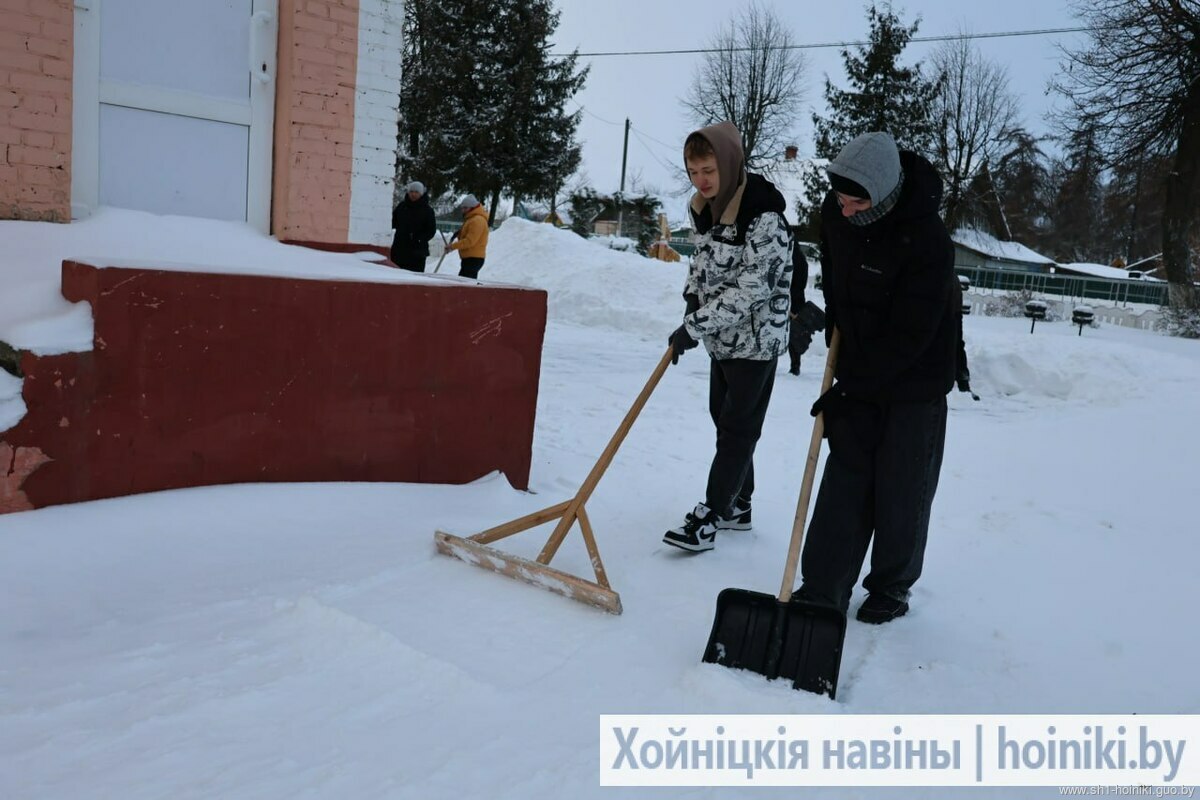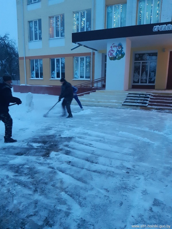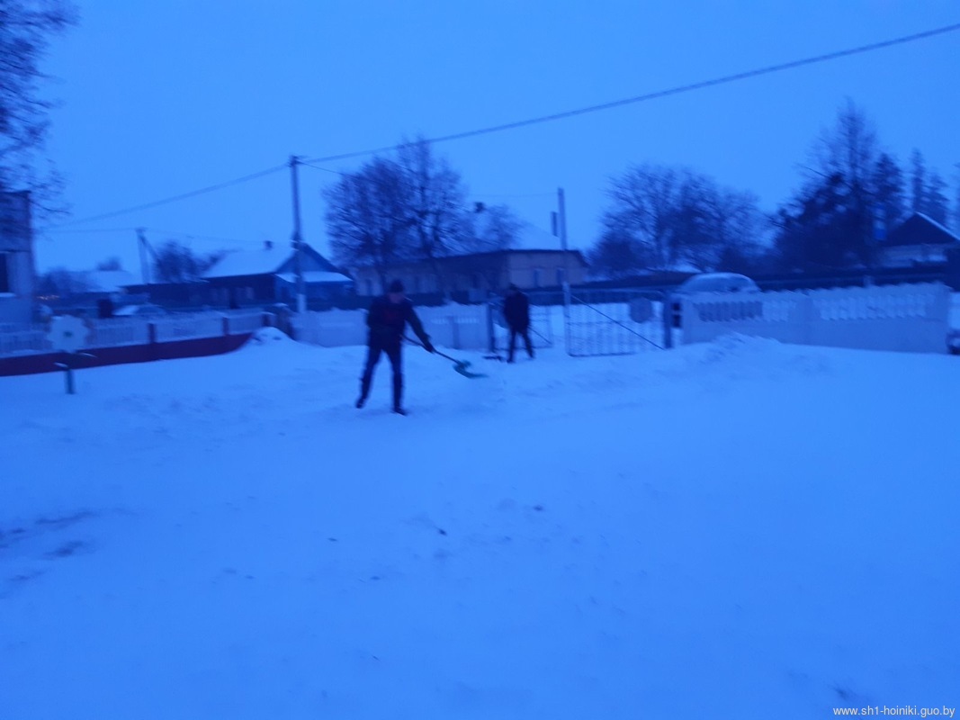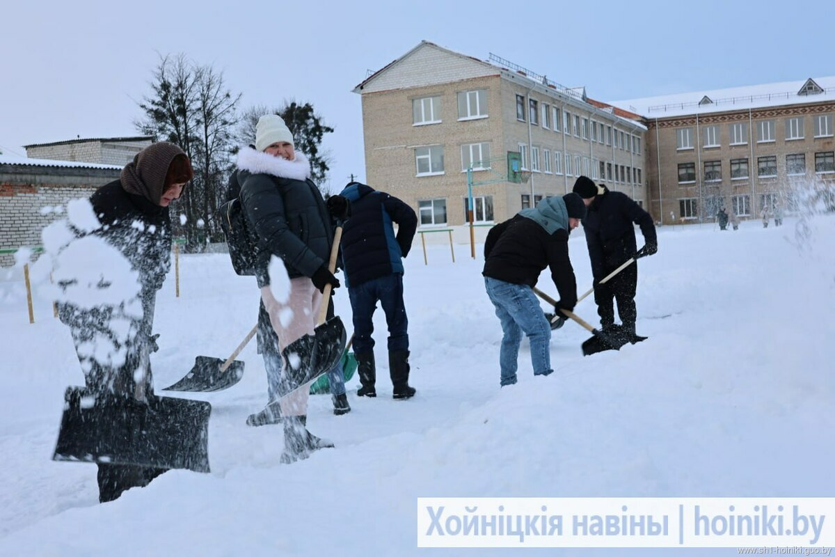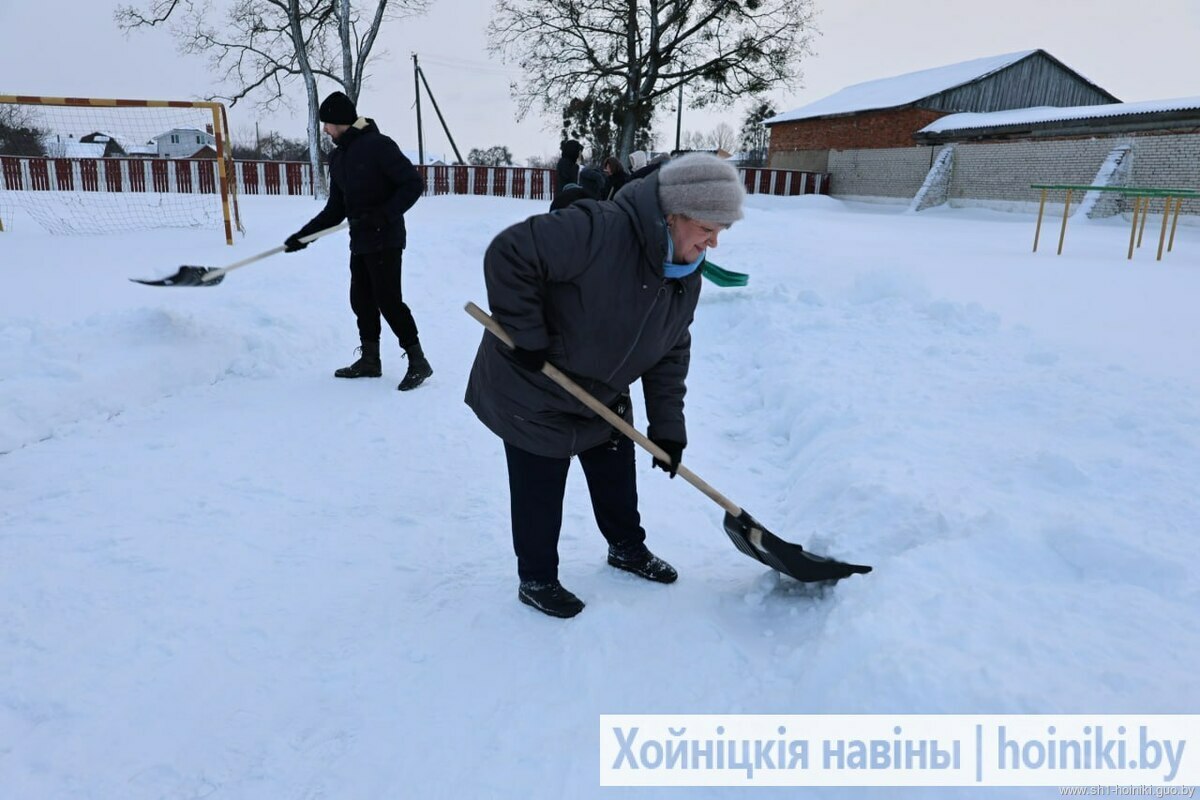 Плечом к плечу с педагогами трудятся и старшеклассники - парни ловко машут лопатами, метр за метром освобождая площадку от снега.