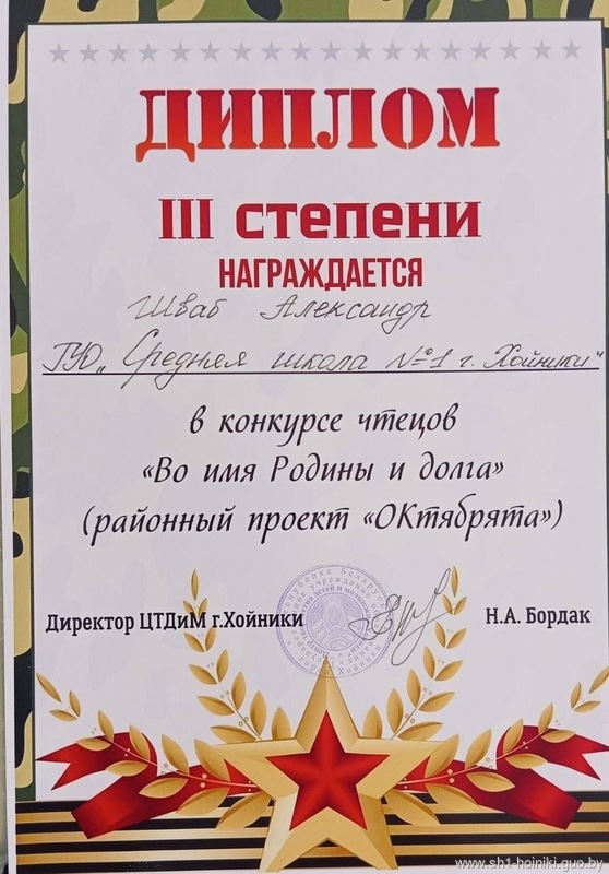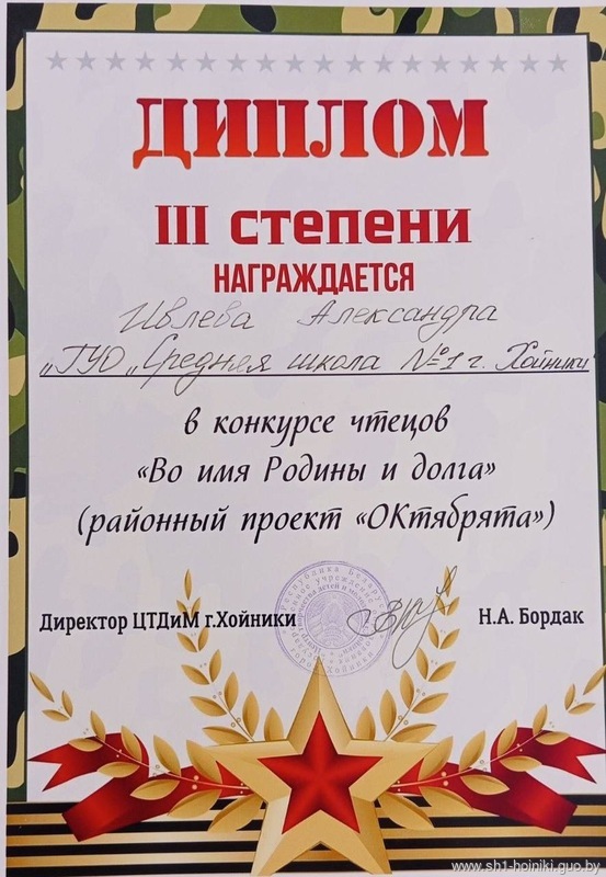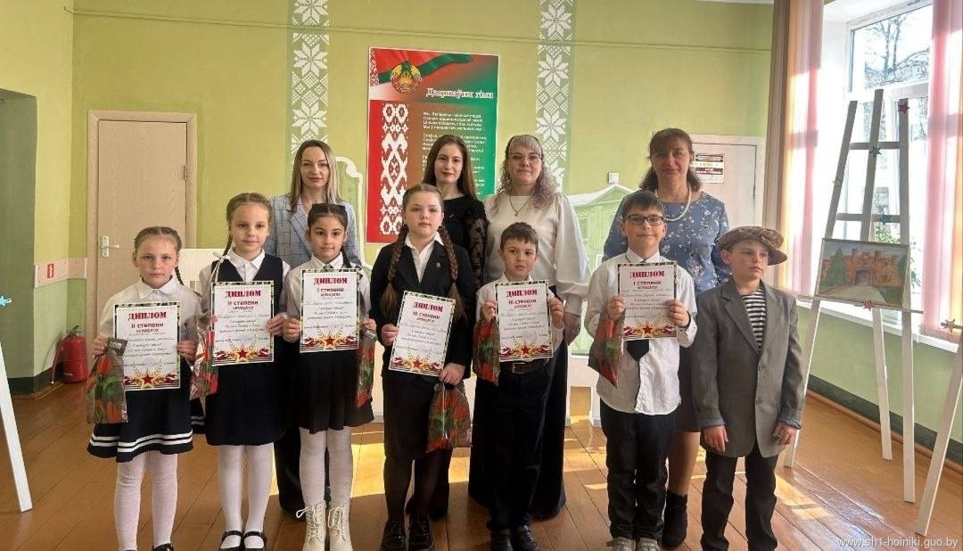 Поздравляем юных чтецов ГУО " Средняя школа N1 г.Хойники" с заслуженным III местом в конкурсе «Во имя Родины и долга»!  Вы показали настоящие таланты и любовь к своей стране. Читайте стихи, делитесь эмоциями и продолжайте радовать нас своими выступлениями!